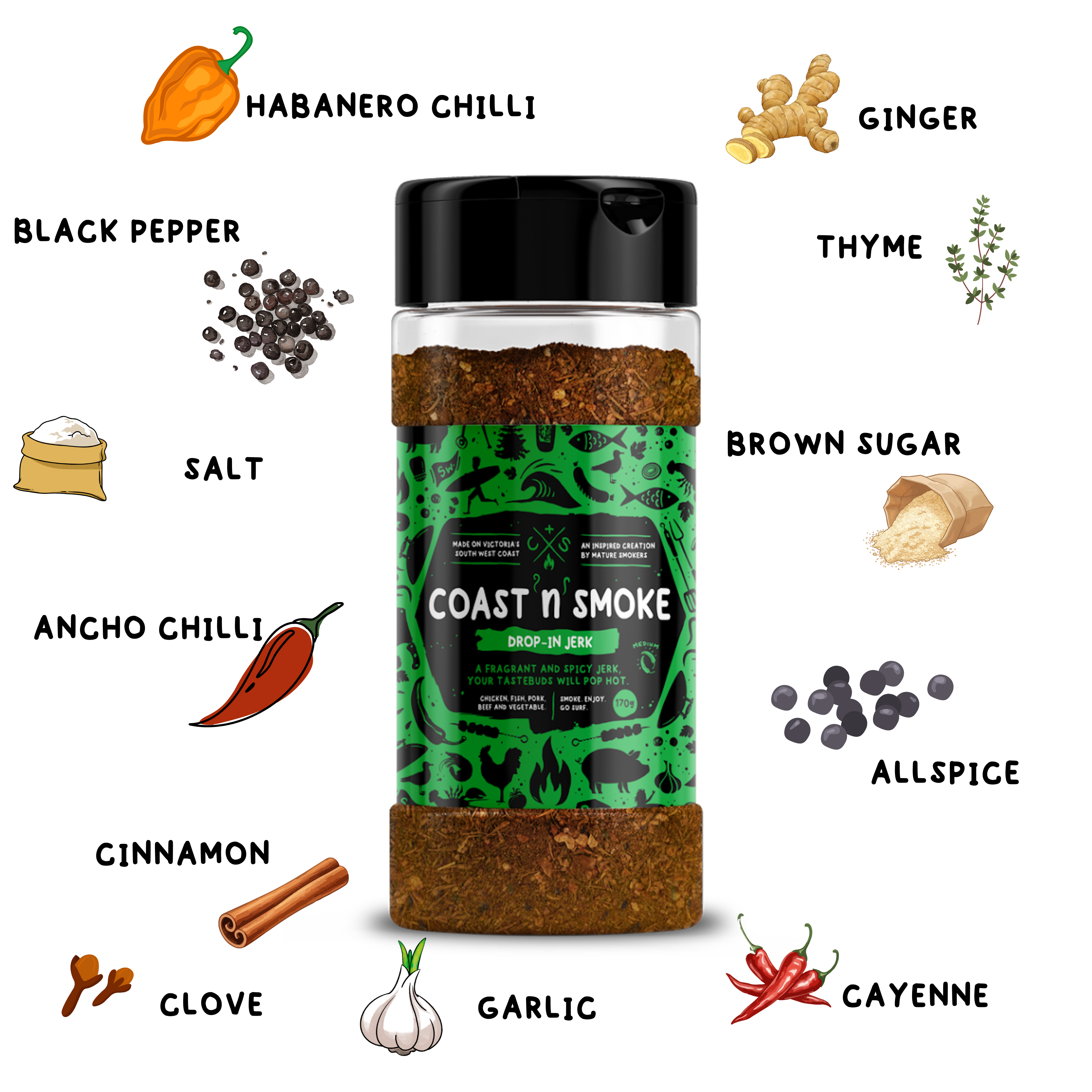 This Jamaican Jerk seasoning is named after the surfing term to "drop in" on a wave. If you drop in on a wave you cut the person already riding the wave off, which makes you a bit of a jerk! Being based on the Surf Coast of Victoria in Torquay, we love to stay true to surfing, coastal and ocean going inspired names.